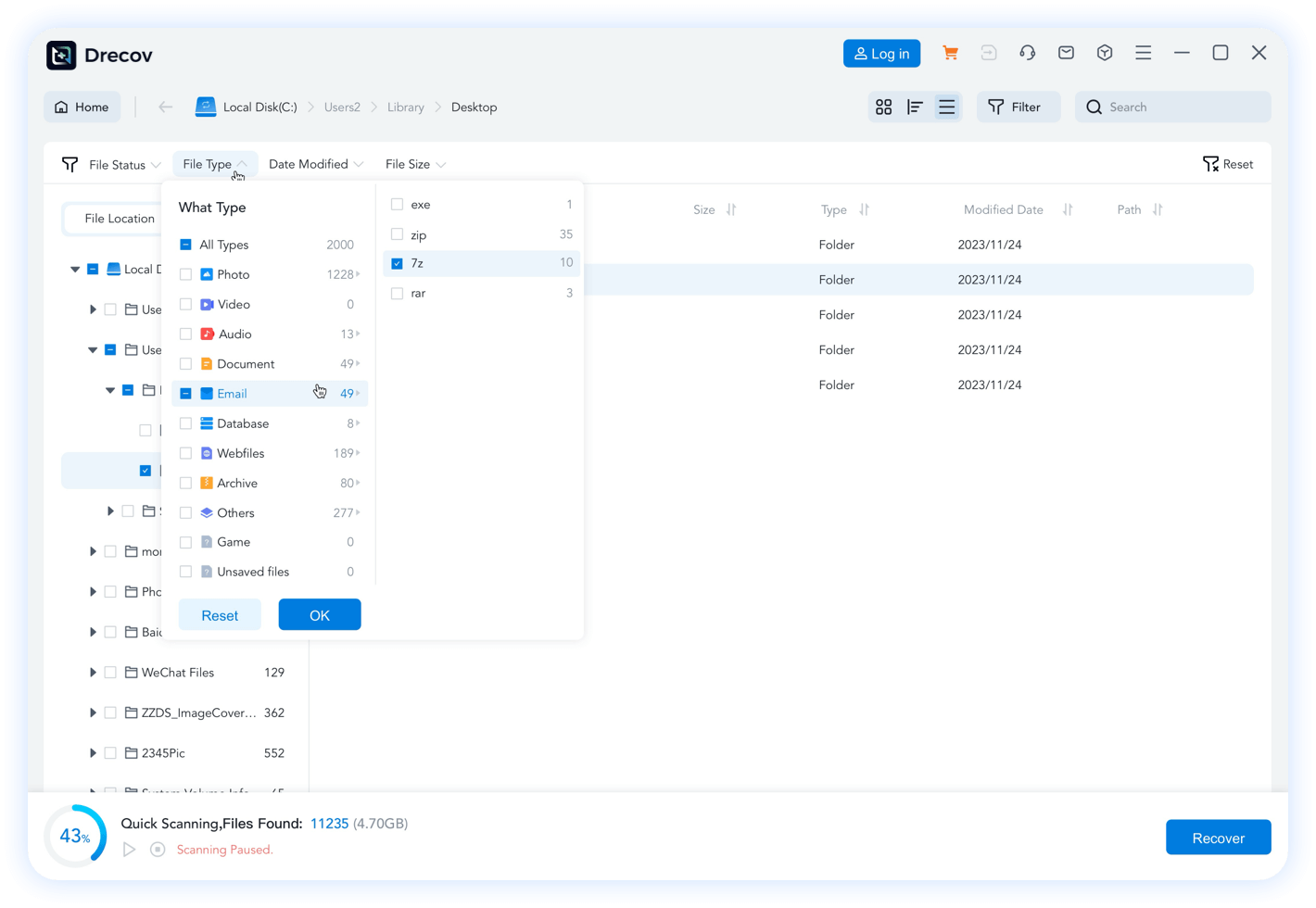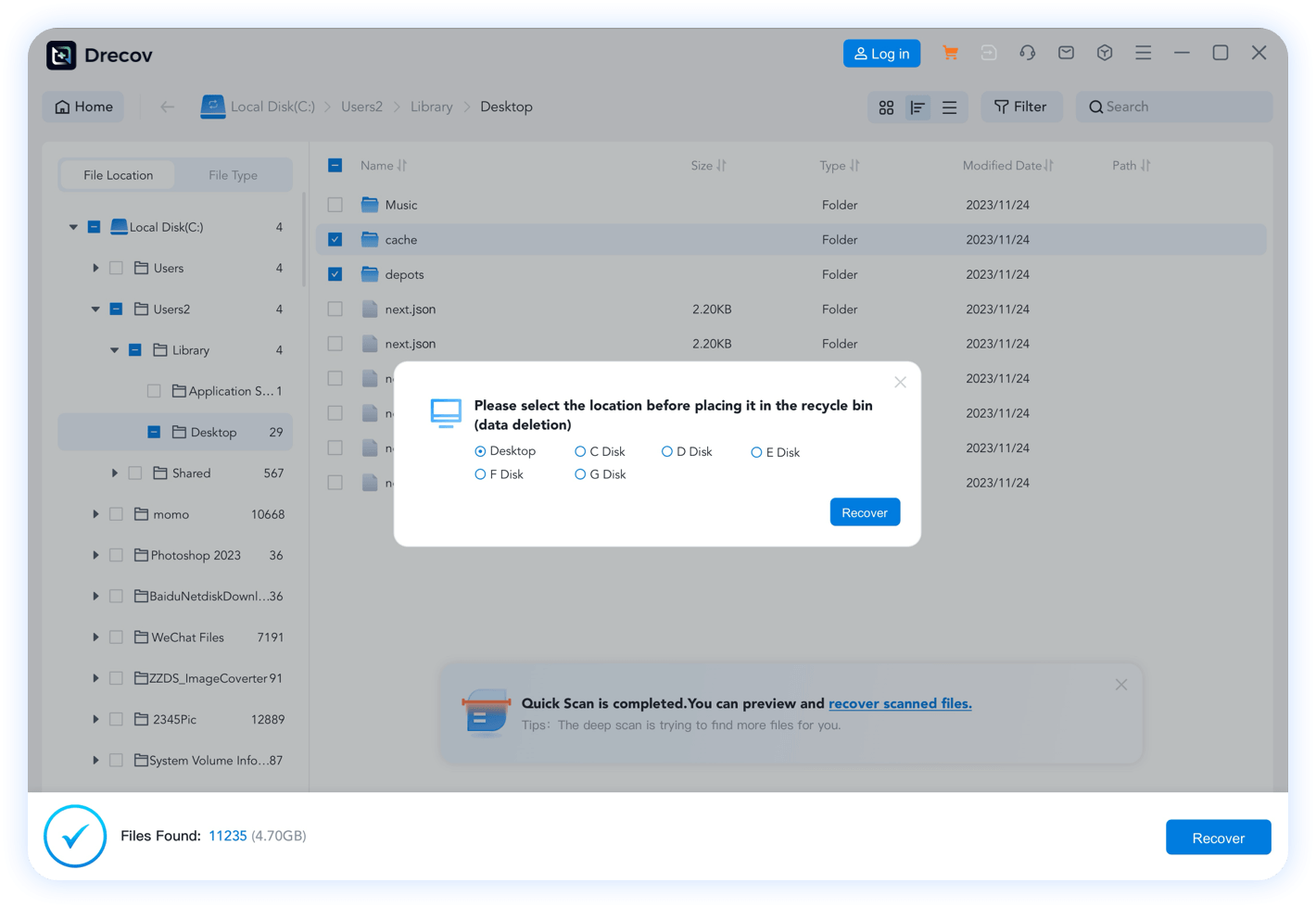 Drecov comprehensive file recovery software fully supports recovering deleted data in all scenarios, such as pressing Shift+Delete or clicking the Delete button.